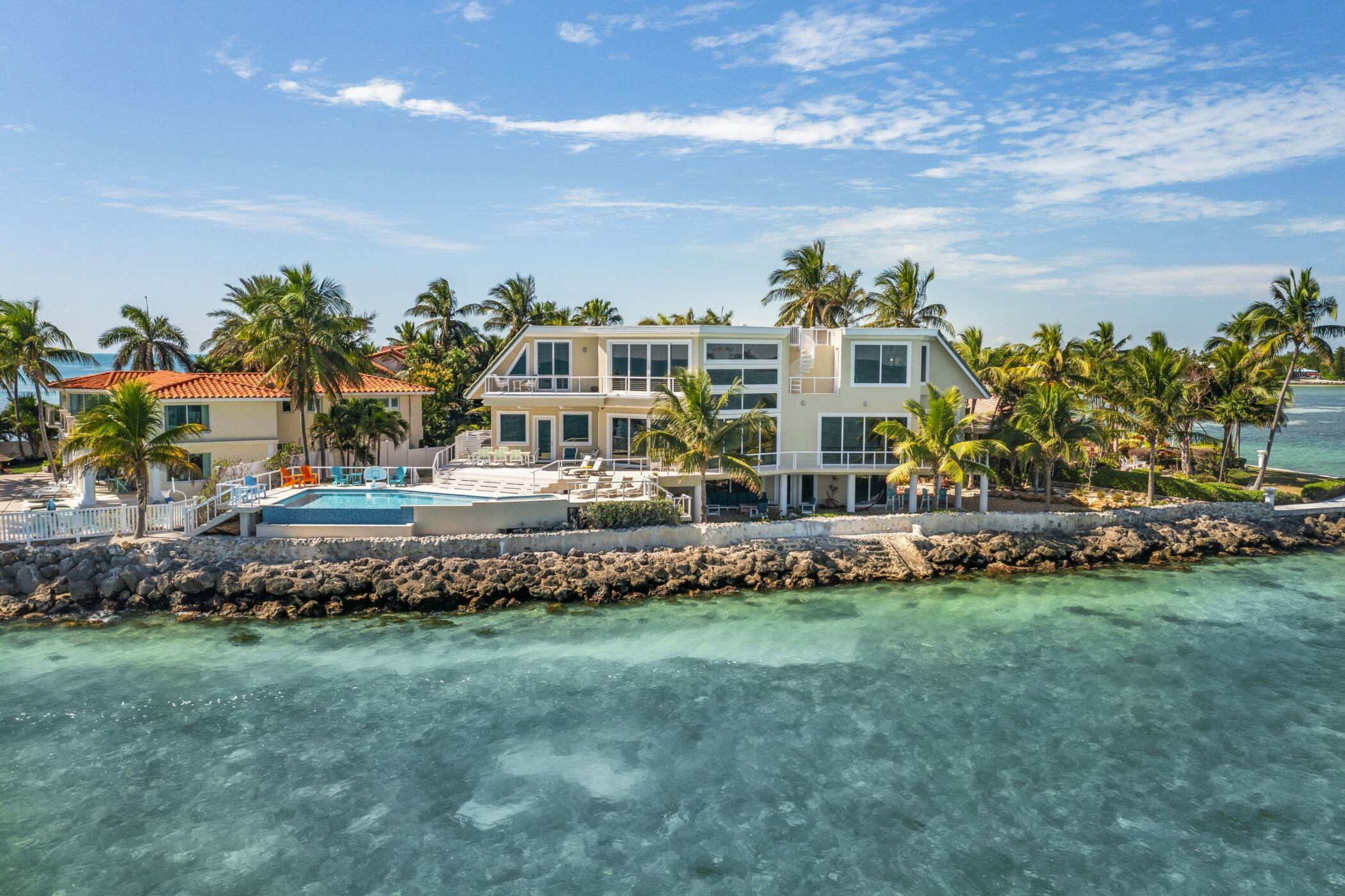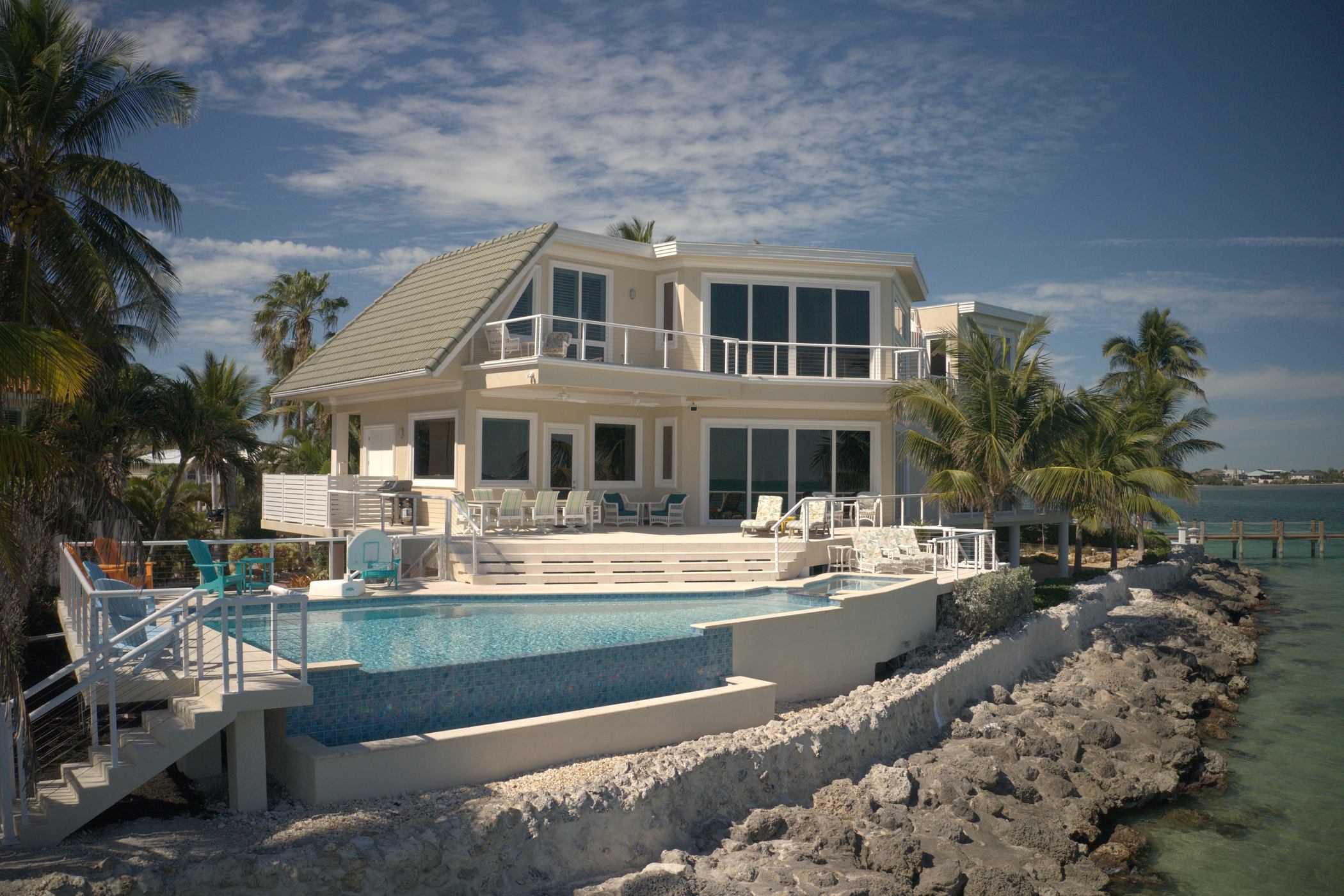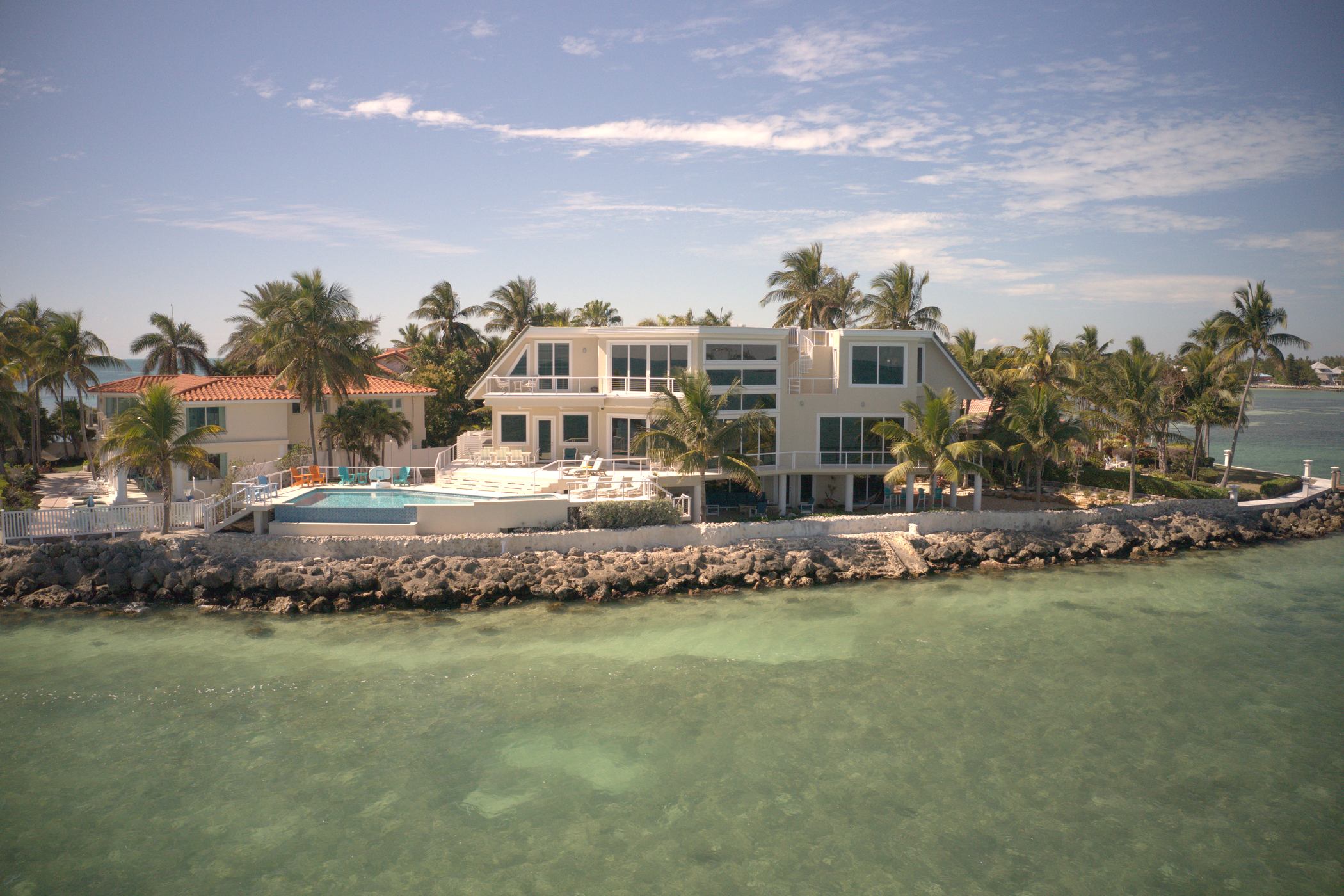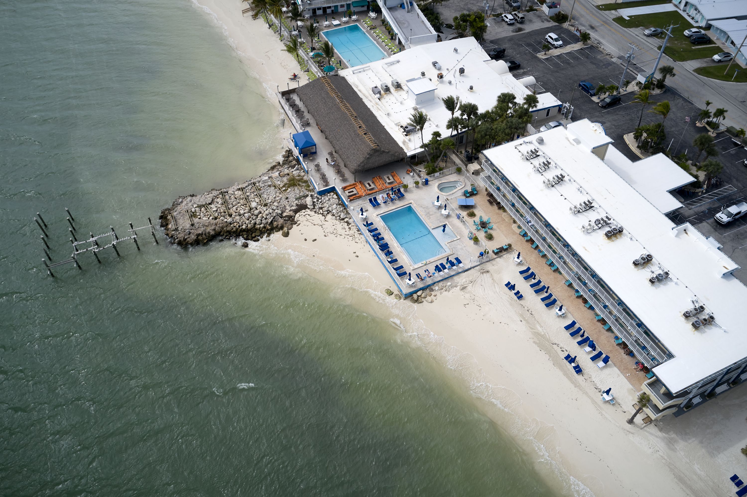 Retouching example, the goal is to remove distracting elements from the picture and provide a more polished look for the property. Among obvious things like roof, water color and beach cleanup, notice how the pool deck was, “power washed”. Top of the picture – gray deck was cleaned up as well. One vehicle was removed from the right edge of the parking lot.