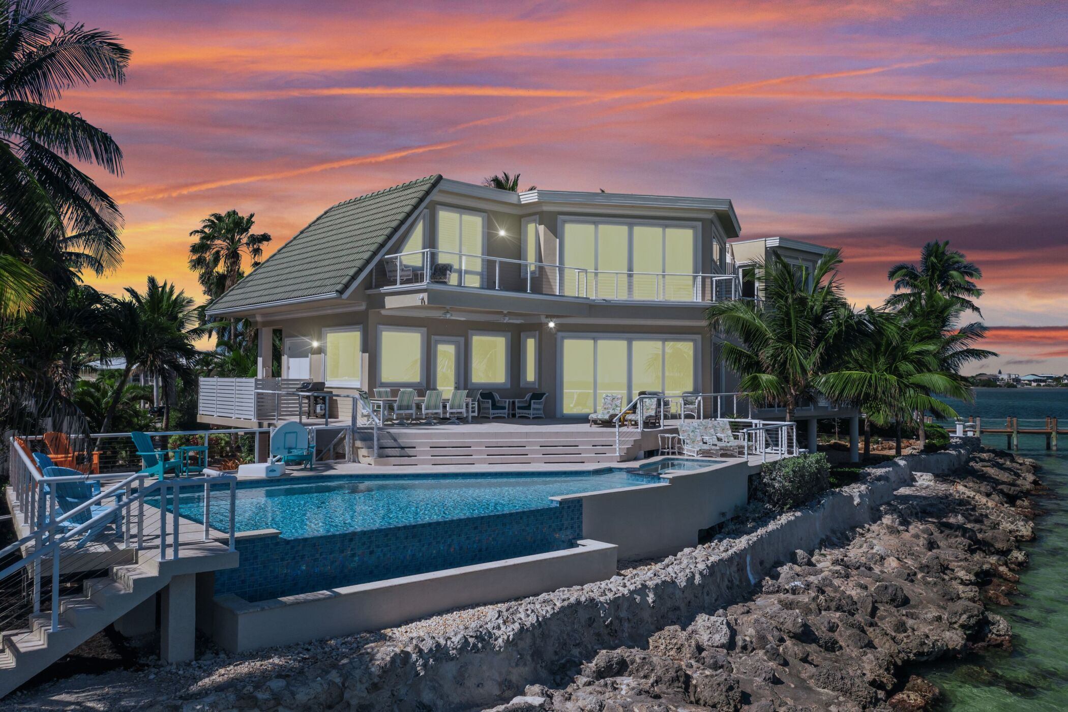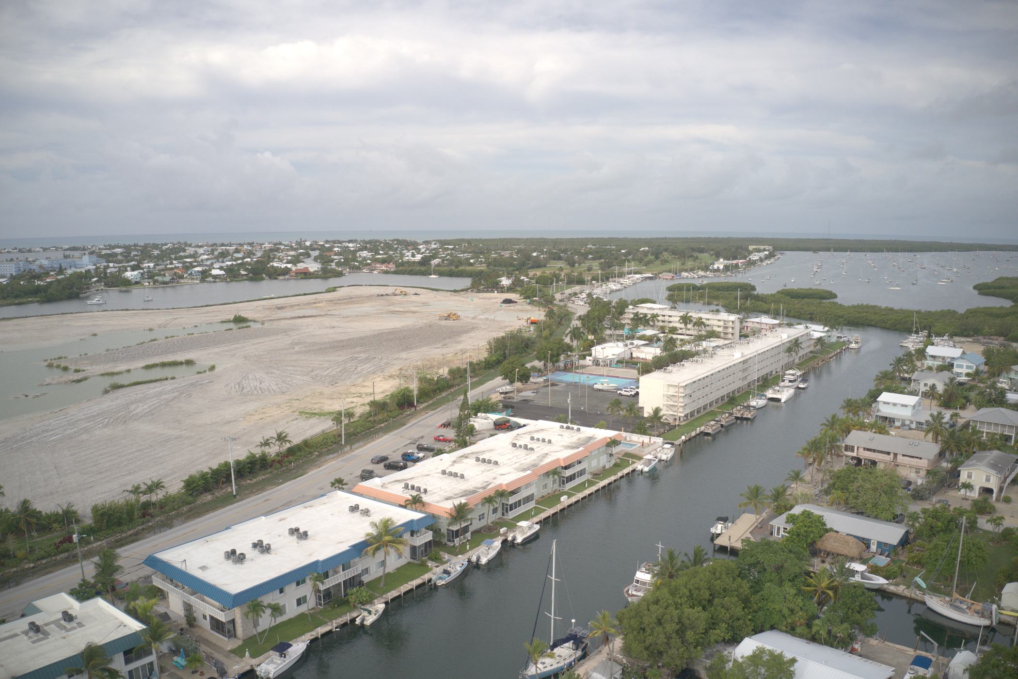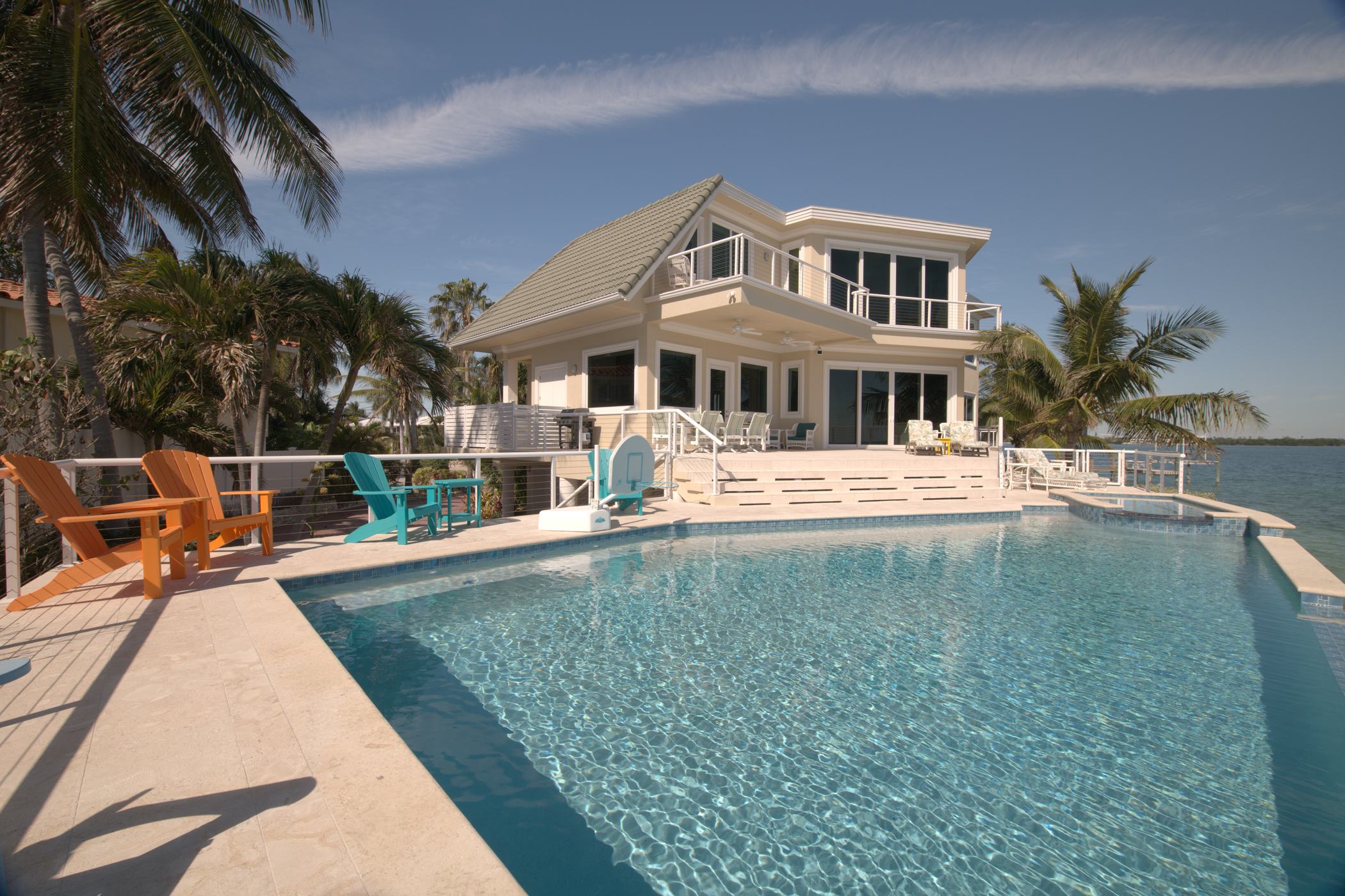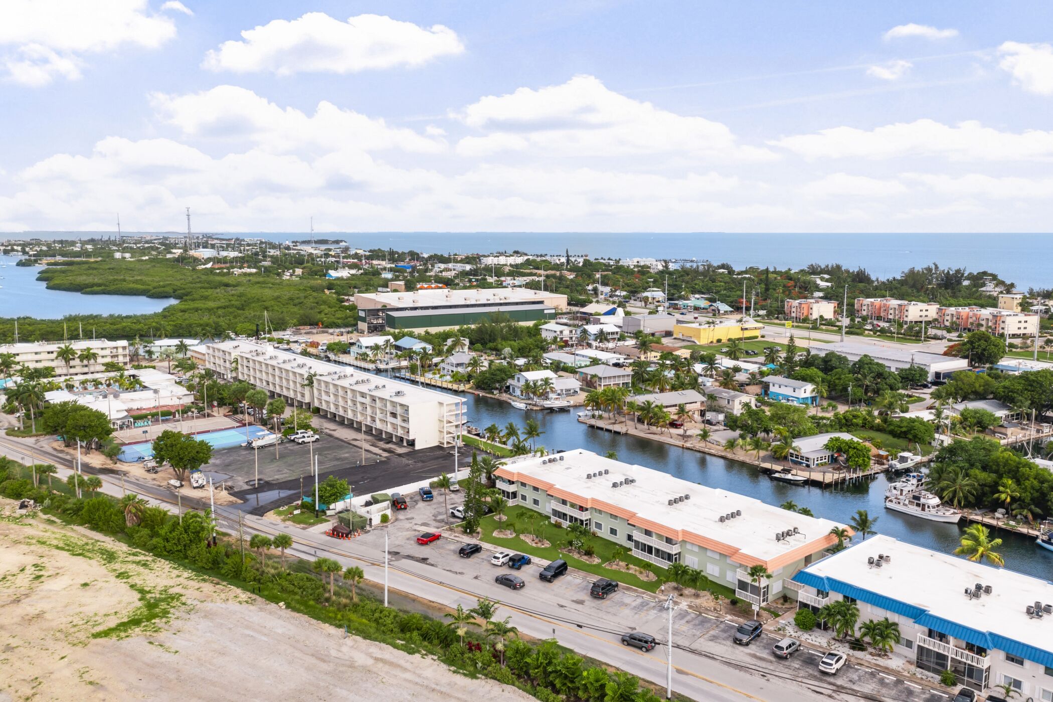 Retouching example, the goal is to remove distracting elements from the picture and provide a more polished look for the property. Among obvious things like roof, water color and beach cleanup, notice how the pool deck was, “power washed”. Top of the picture – gray deck was cleaned up as well. One vehicle was removed from the right edge of the parking lot.